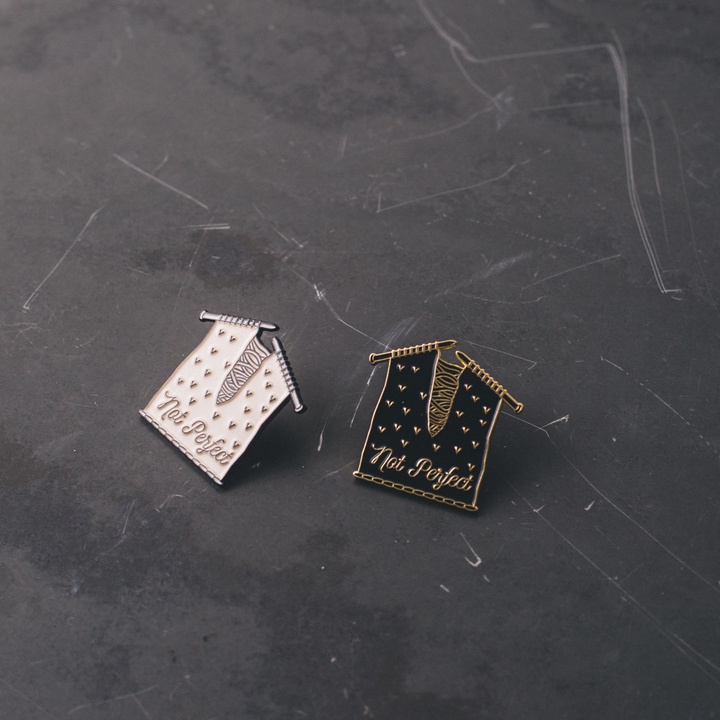 No one is perfect! A dropped stitch pin serves as a reminder that knitting mistakes happen to everyone. Spruce up a knitting project bag, jean jacket, or notions pouch with these enamel pins. Each pin comes on a thick knitting chart inspired backing card.