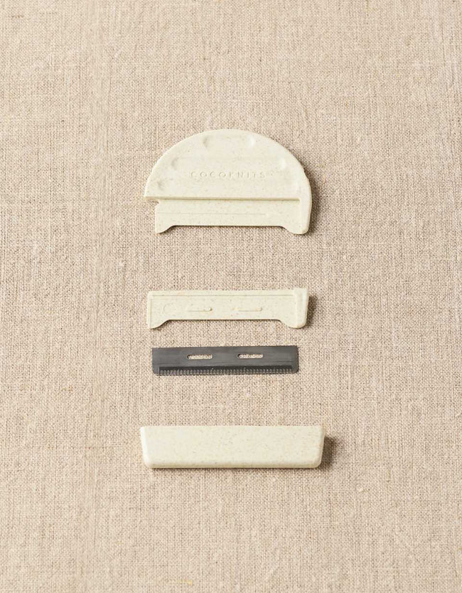 Keep your garments looking fresh and pill-free with this gentle steel comb, which efficiently removes fibre fuzz buildup. This updated design is easier to hold and has a cover that clicks into place. The steel comb is still replaceable and works with the same Cocoknits Fuzz Comb Refills. The body is 100% biodegradable PLA, made from plant fibre.